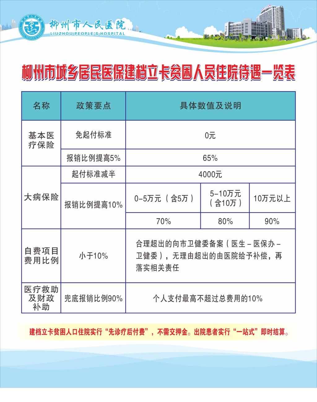 4、精準扶貧、醫療救助人員免交住院押金,出院實行一站式結賬,按照醫保及國家政策享受相應的醫療保險及政府兜底待遇。