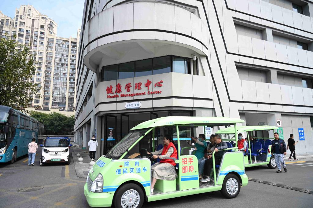 便民交通車以“固定站點+靈活機動”的形式,在院內循環行駛,招手即停,供患者和家屬免費搭乘。目前在院內設置了7個站點,包括門診、住院樓、第二住院樓/特殊醫技樓、健康管理中心/停車樓以及第三住院樓、后勤樓、急診醫學科。這些站點覆蓋了醫院的主要樓棟,為患者和家屬提供了全方位的運送服務。與此同時,便民交通車招手即停,在乘客不多的情況下,還能根據乘客的具體需求,將其送到指定的地點,這種靈活的服務方式大大提升了患者的就醫便利性。在路口保安人員也同時負責交通疏導,幫助便民交通車更安全、快速地通過路口。
