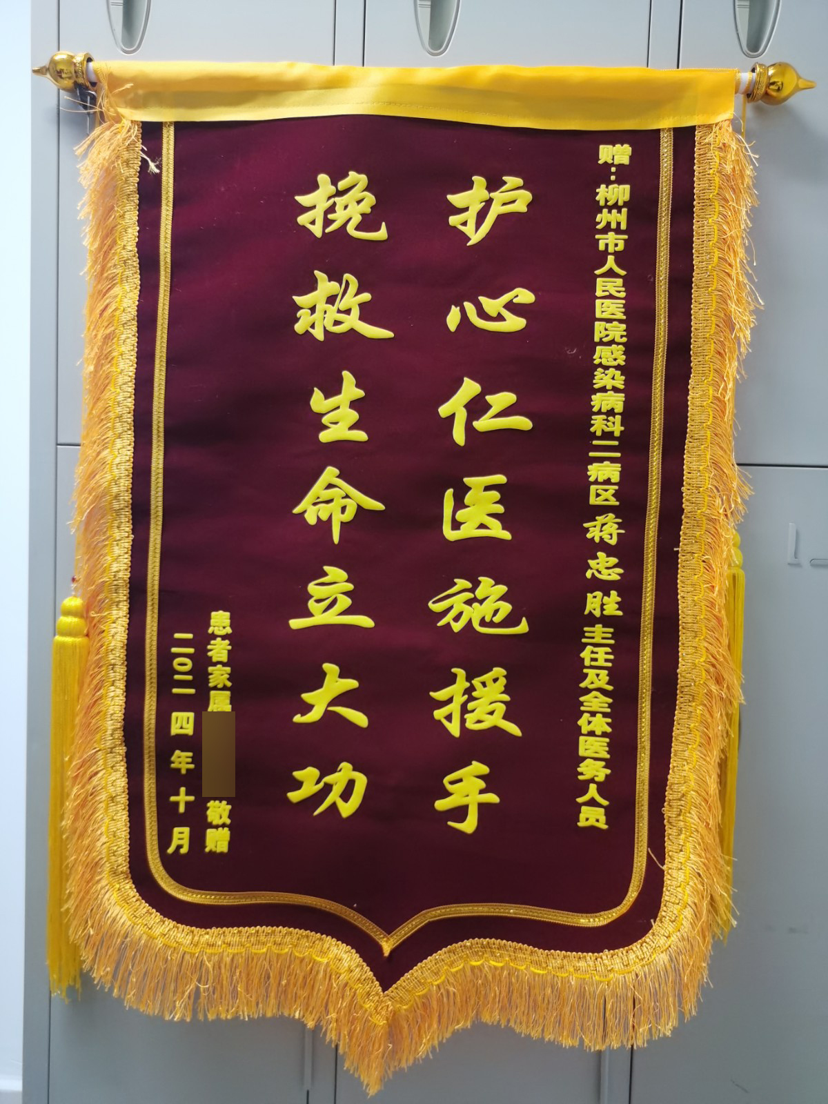 10月10日,是邱先生順利出院的日子。在醫護人員的護送下邱先生一家走到病區門口,他鄭重地將一面鮮紅的錦旗緩緩打開,“護心仁醫施援手,挽救生命立大功。”看著錦旗上的金色大字,邱先生感慨不已:“感謝柳州市人民醫院的醫生護士!能在求醫路上遇到了你們,是我最大的幸運!”