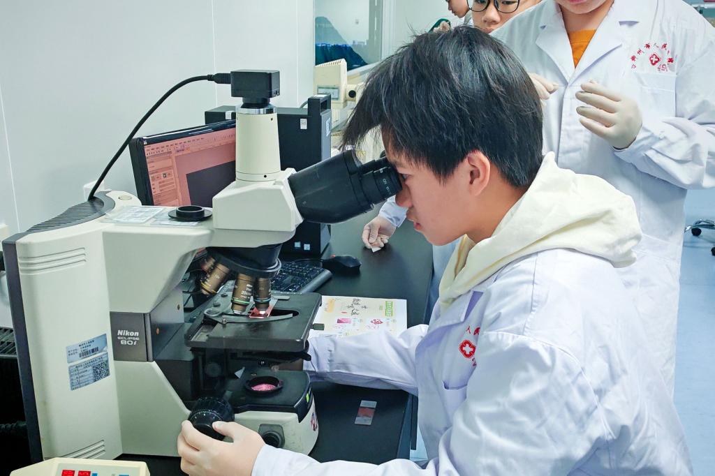 顯微鏡操作臺前,醫務人員細心地教導如何調節顯微鏡和尋找視野的技巧,經過認真的聆聽和學習,孩子們在短時間內便能使用顯微鏡進行觀察。