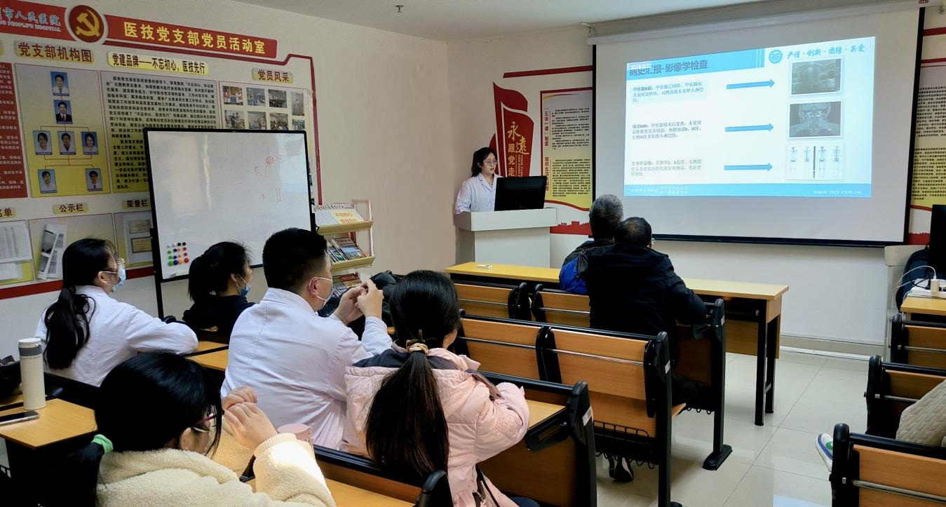 榮獲二等獎的住培醫師盧婉瑩則從病史介紹、治療過程、總結反思三個方面展開,講述了一例甲狀腺乳頭癌并頸部淋巴結、骨轉移的多學科聯合治療病例。她通過條理清晰、邏輯嚴密的表達,展現了出色的醫學基礎知識和臨床實踐能力。
