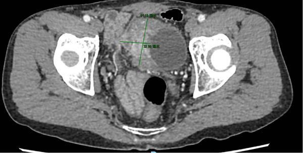 術(shù)前影像提示膀胱右側(cè)壁巨大腫瘤,侵犯腹膜及膀胱外脂肪組織