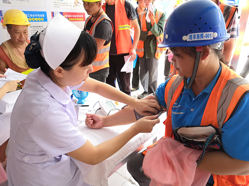 農(nóng)民工是城市的建造者,他們?yōu)槌鞘械陌l(fā)展付出了汗水、貢獻(xiàn)了力量。為使農(nóng)民工充分享受到城市發(fā)展的紅利,感受到社會(huì)對(duì)他們的關(guān)愛(ài),2019年7月27日,我院團(tuán)委組織醫(yī)務(wù)人員志愿者來(lái)到華潤(rùn)幸福里項(xiàng)目工地,為該項(xiàng)目工地的100余名農(nóng)民工進(jìn)行了健康體檢和健康知識(shí)講座。