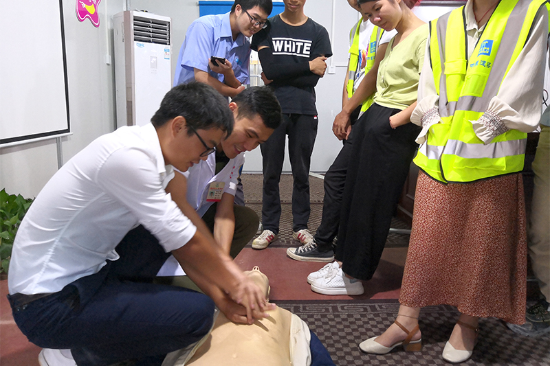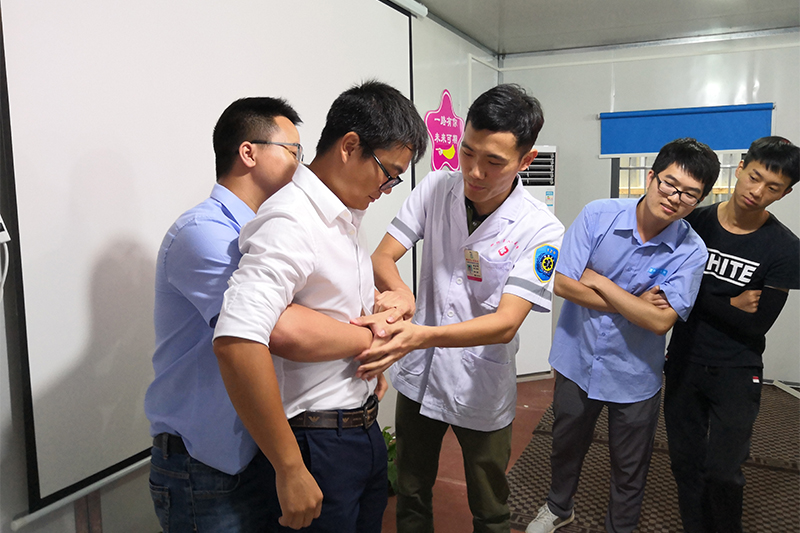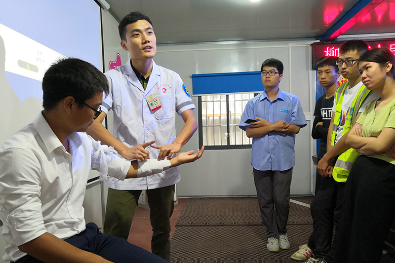 隨后,來(lái)自急診科的胡慶峰和感染性疾病科的張鵬等兩名志愿者,分別就工地常見(jiàn)的砸傷、擦傷、骨折、中暑、電擊等傷害的應(yīng)急處理、艾滋病的防治知識(shí)向工地管理人員作了專題健康講座。兩名志愿者結(jié)合具體案例,深入淺出地就相關(guān)知識(shí)進(jìn)行了普及,手把手指導(dǎo)工地管理人員進(jìn)行了心肺復(fù)蘇、傷口包扎、海姆立克急救法等急救技能的練習(xí),對(duì)他們提出的問(wèn)題進(jìn)行了專業(yè)解答,并免費(fèi)發(fā)放了200盒安全套,得到工地管理人員的一致好評(píng)。