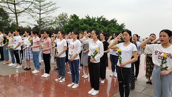 活動現場氣氛莊嚴肅穆。大家懷著崇敬的心情,跟隨飄揚的團旗,緩步走上臺階,整齊地列隊在革命烈士紀念碑前,認真地聆聽主持人對五四運動歷史及柳州烈士陵園情況的介紹和講解。兩名團員代表向革命烈士紀念碑敬獻花圈,大家低頭默哀,緬懷先烈,寄托哀思。默哀結束后,全體團員重溫入團誓詞,并用齊唱團歌的方式表達了自己不忘初心的堅守和永遠跟黨走的決心。