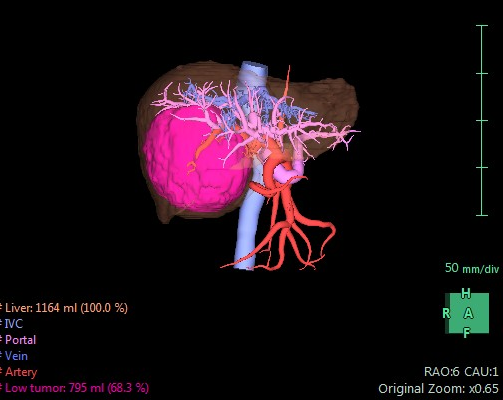 我院放射科科研團隊在劉鐵軍主任帶領(lǐng)下,近年來經(jīng)過不斷探索,突破了多項技術(shù)難關(guān),利用原有富士Synapse v3.0醫(yī)學(xué)影像軟件系統(tǒng),對3D模擬切除腫瘤技術(shù)進行了多項創(chuàng)新。其中肝臟腫瘤及顱內(nèi)腫瘤的模擬切除技術(shù)目前已應(yīng)用成熟,不僅為臨床的治療決策提供了精準的依據(jù),也在治療效果的評估上發(fā)揮著舉足輕重的作用。據(jù)劉鐵軍主任介紹:該項技術(shù)是利用我院先進的飛利浦64排螺旋CT快速掃描血管造影成像獲得良好的原始CT圖像。再結(jié)合軟件系統(tǒng),經(jīng)過一系列復(fù)雜精準的圖像后處理程序后,可以360度無死角完整顯示肝臟血管與腫瘤的毗鄰關(guān)系,為制定合理的手術(shù)方案和采取正確的術(shù)中策略提供重要的術(shù)前參考,避免了手術(shù)中的盲目性與不確定性導(dǎo)致誤傷到腫瘤周緣的大血管而引起術(shù)中大出血。此外,該項技術(shù)還可以單獨測算腫瘤體積,同時精準模擬切除的腫瘤周緣肝組織,計算出手術(shù)總共切除肝組織量,保證術(shù)中完整切除病灶和最大限度保留殘肝組織及血液流出道、膽道,并較準確的測量出肝臟體積及殘肝體積,減少手術(shù)對肝實質(zhì)的損傷,為制定合理的手術(shù)方案和采取正確的術(shù)中策略提供重要的術(shù)前參考。