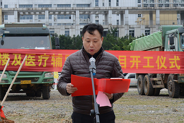上午10點,開工現場彩旗飄展,施工機械整裝待發。項目主管方代表市衛生計生委副主任胡學林、規劃信息科科長胡國威,市發展改革委社發科科長李杰,業主方代表我院紀委書記廖流濤、副院長黎榮山,代建方代表市建投公司副總經理李慶于,施工方代表廣西二安公司黨委副書記、常務副總經理趙澤俊,及其九分公司經理黎明、財務科科長廖聰,醫院職能科室負責人,施工人員等50余人參加儀式。