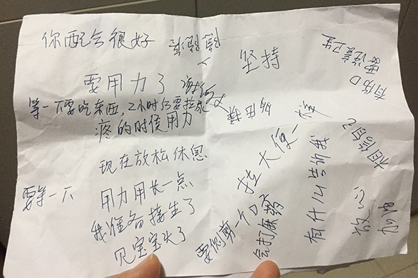 凌晨4點,整個產(chǎn)房寂靜無聲,唯一待產(chǎn)的產(chǎn)婦也發(fā)不出一點聲響,接生的助產(chǎn)士此刻心里是忐忑的。產(chǎn)房里此時僅有兩個助產(chǎn)士,她們一人為產(chǎn)婦接生,另一人負(fù)責(zé)與她“溝通”。小小的一張紙,寫滿了令人感動的話語,“要用力了、用力用長一點、見寶寶頭了、相信自己……”一句句叮囑的話語,字字暖心,都是對產(chǎn)婦的激勵。當(dāng)產(chǎn)婦做得好時,我們的助產(chǎn)士就不停地對她豎起大拇指,給她增添信心。也許是即將成為母親的本能,也許是我們助產(chǎn)士的耐心和溫柔打動了她,這名產(chǎn)婦非常配合助產(chǎn)士的工作,她不鬧騰也不反抗,用盡全力將孩子帶到這個世界。