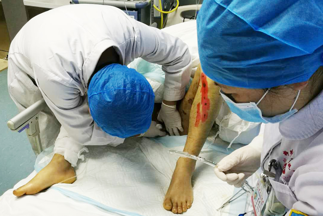 楊師傅在“鬼門關(guān)”走了一圈之后,緊接而來的是深部傷口感染的難關(guān),被公牛角頂傷的傷口寬約5cm、深17cm,最可怕的是該傷口緊挨著肛門。楊師傅一旦排便,糞便污染傷口不可避免。糞便污染導(dǎo)致的臀部及盆腔深部結(jié)締組織感染,一旦發(fā)生感染將導(dǎo)致感染性休克,他便又要到“鬼門關(guān)”去走一圈了。急診科醫(yī)護(hù)人員絞盡腦汁,采取各種辦法避免糞便污染肛周傷口。創(chuàng)新性聯(lián)合交替運用7.5號氣管插管、導(dǎo)尿管+負(fù)壓吸引的新方法來科學(xué)的抽吸患者糞便,結(jié)合深部傷口VSD技術(shù),配合傷口定期換藥,最終促使肛周深部傷口隧道逐漸愈合。