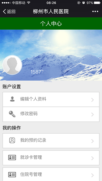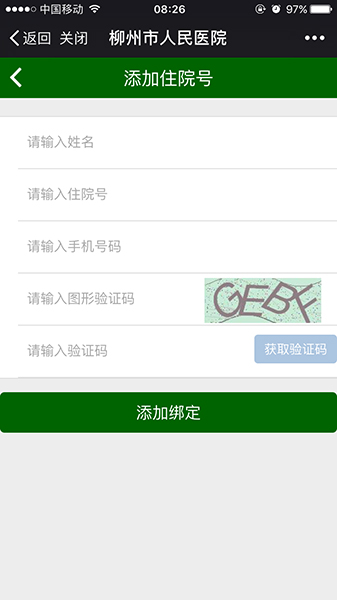 進入“柳州市人民醫院”微信公眾號 → 信息查詢 → 個人中心 → 住院號管理 → 添加住院號 →根據提示依次輸入姓名、住院號、手機號碼、驗證碼,手機號碼需與患者辦理入院登記的手機號一致。添加成功后,在住院號管理中可看到住院信息。