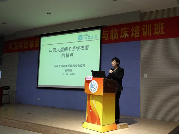 柳州市人民醫(yī)院黎榮山副院長出席了開幕式并作了熱情洋溢的致辭。此次培訓班邀請了湖南省中南大學附屬湘雅醫(yī)院風濕科左曉霞教授,廣東省人民醫(yī)院風濕科董光冨教授,廣州中醫(yī)藥大學第一附屬醫(yī)院風濕科林昌松教授,廣西醫(yī)科大學第一附屬醫(yī)院風濕科趙鋮、米存東教授,自治區(qū)人民醫(yī)院風濕科林金盈教授,廣西中醫(yī)藥大學第一附屬醫(yī)院風濕科吳金玉教授,廣西中醫(yī)藥大學附屬瑞康醫(yī)院風濕科龐學豐教授,桂林醫(yī)學院附屬醫(yī)院風濕科莫漢有教授等多位省內(nèi)外知名專家授課。