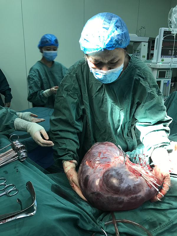 在與產婦家屬充分溝通之后,我院產科、麻醉科、血液科、病理科等科室強強聯手,通力合作,漂亮的完成了手術。產科譚衛強主任醫師在手術過程中先克服腫瘤遮擋視線、操縱空間受阻等困難,順利將胎兒取出,再通過鉗夾、切開、縫合等寥寥數個操作,簡單快速地就將腫瘤完整摘除,毫無破損,并且患者出血量不多,生命體征保持平穩。整個手術過程大約40分鐘,可以說是快、精、準!譚衛強主任醫師憑借其精湛純熟的專業操作技術縮短了手術的時間,讓家屬懸著的心終于踏實了。