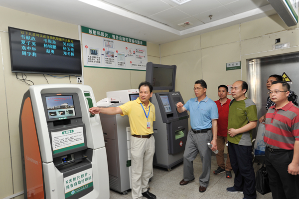 潘光棟副院長和林正奎副院長代表醫院歡迎調研組的到來,并引領大家首先來到門診大廳自助繳費機、檢驗報告機、查詢機、分級診療接待臺前,向調研組介紹相關設備的功能和使用情況,隨后又分別到兒科門診急診、藥房、放射科等科室參觀考察。鐘文干一行對我院各項工作的管理和運行情況給予肯定,并現場與我院相關科室的負責人就公立醫院改革的落實情況以及實行醫改后對醫院門診量的影響等進行詳細的了解。我院醫務部、護理部、門診辦等相關職能科室的負責人陪同考察。