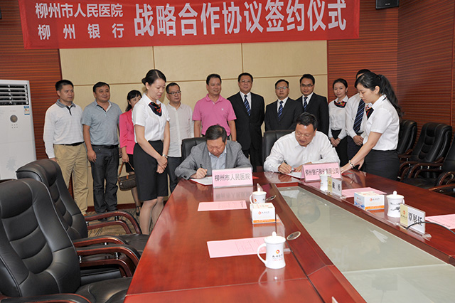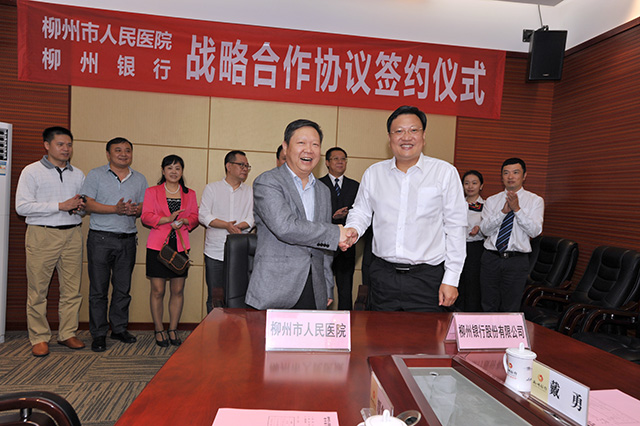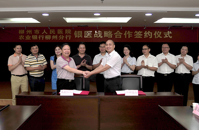 我院本著平等互利、合作共贏的原則,經過充分磋商后,最終與農業銀行柳州分行、柳州銀行達成合作意向,并于7月21日下午與農業銀行柳州分行、10月13日下午與柳州銀行分別舉行了銀醫戰略合作簽字儀式。