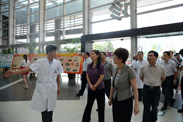 2015年8月25日上午國家衛生計生委調研組到我院進行城市公立醫院改革情況實地調研,調研組由國家衛計委直屬機關黨委副書記鹿文媛率領一行四人,到我院內科門診和心血管內科病三區對病人就醫情況進行實地了解,陪同調研的有自治區衛生計生委副主任梁遠、柳州市副市長崔惠柳等領導,我院潘光棟、林正奎副院長也陪同調研。