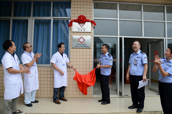 2015年9月11日上午,由市公安局、市衛生計生委主辦的“市區醫療機構進駐公安監所暨院所醫療合作簽約儀式”,自治區公安廳副廳長李躍,副市長、市公安局局長周長青,市衛生計生委副主任肖波等領導出席了簽約儀式,我院林正奎副院長與市拘留所韋裕慶所長共同簽署了《所院醫療合作協議》,簽約儀式后,我院和市拘留所雙方代表在市拘留所共同出席了“柳州市人民醫院駐柳州市拘留所醫療點”揭牌儀式。