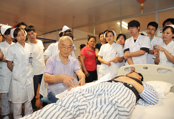 謝永慈先生親臨我院康復醫學科,系統地介紹了康復護理的基礎理論,現場傳授康復訓練手法和技巧,對患者進行臥床、行走、言語及吞咽等全方位的康復指導,重點強調預防畸形,發揮患者最大潛能,實現自我照顧。謝老先生以詼諧幽默的語言為在場的學員和患者營造一種歡快的訓練氛圍,受益匪淺。