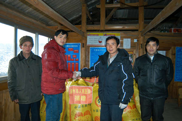 1月18日,保衛(wèi)科干事成文虎和黨辦干事鐘計(jì)鋒代表醫(yī)院將全院職工捐贈(zèng)的2400多件共70多個(gè)大編織袋御寒衣物送達(dá)融水縣良寨鄉(xiāng)培洞村,幫助村民度過(guò)隆冬。