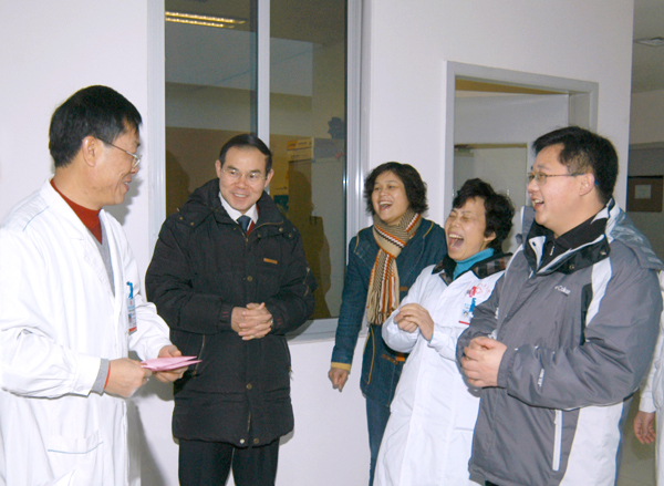 2月1日上午,院領導帶領職能部門正副職向春節期間值班的工作人員拜年,發放慰問金,并為他們送去了新春的祝福。圖為黨委書記胡世紅給藥劑科工作人員拜年。