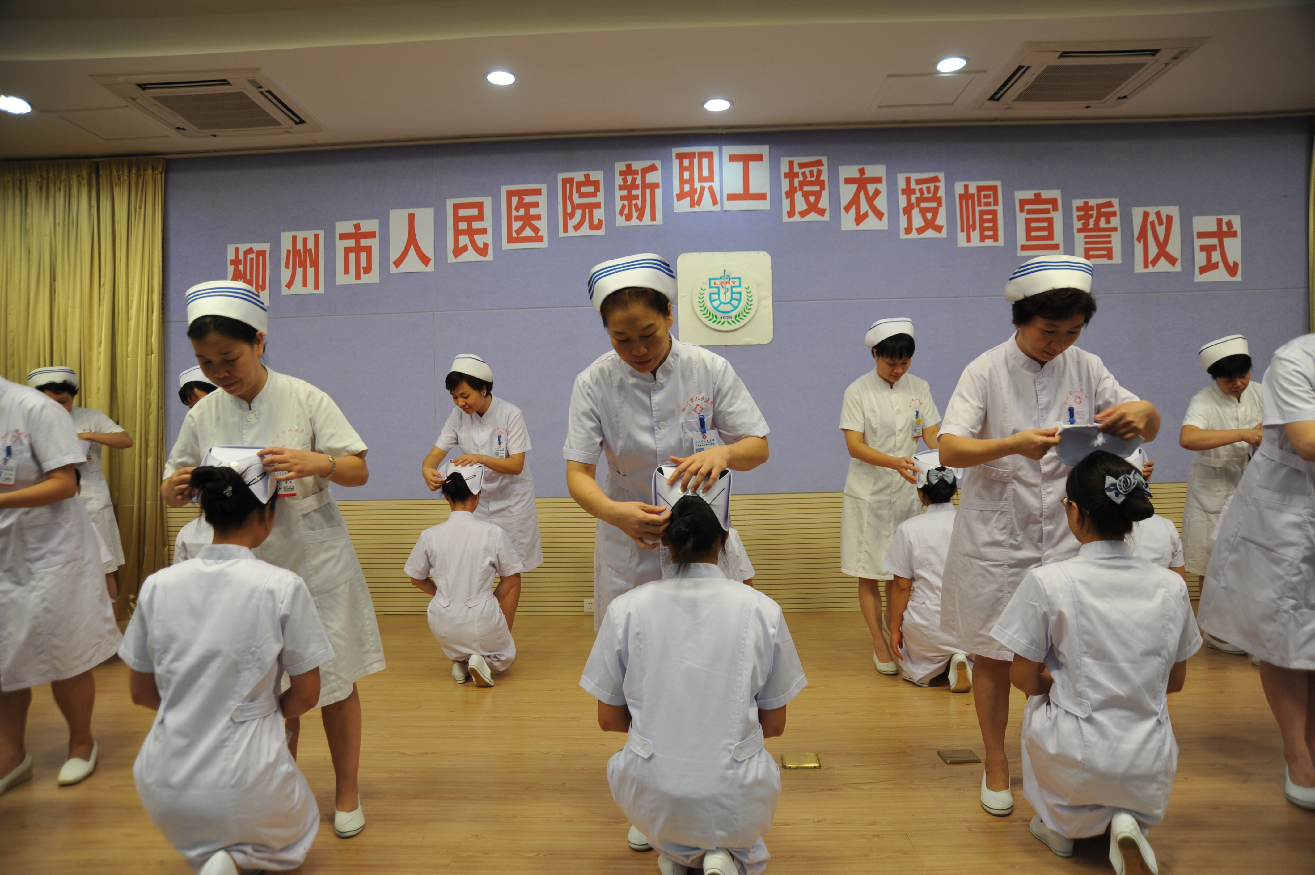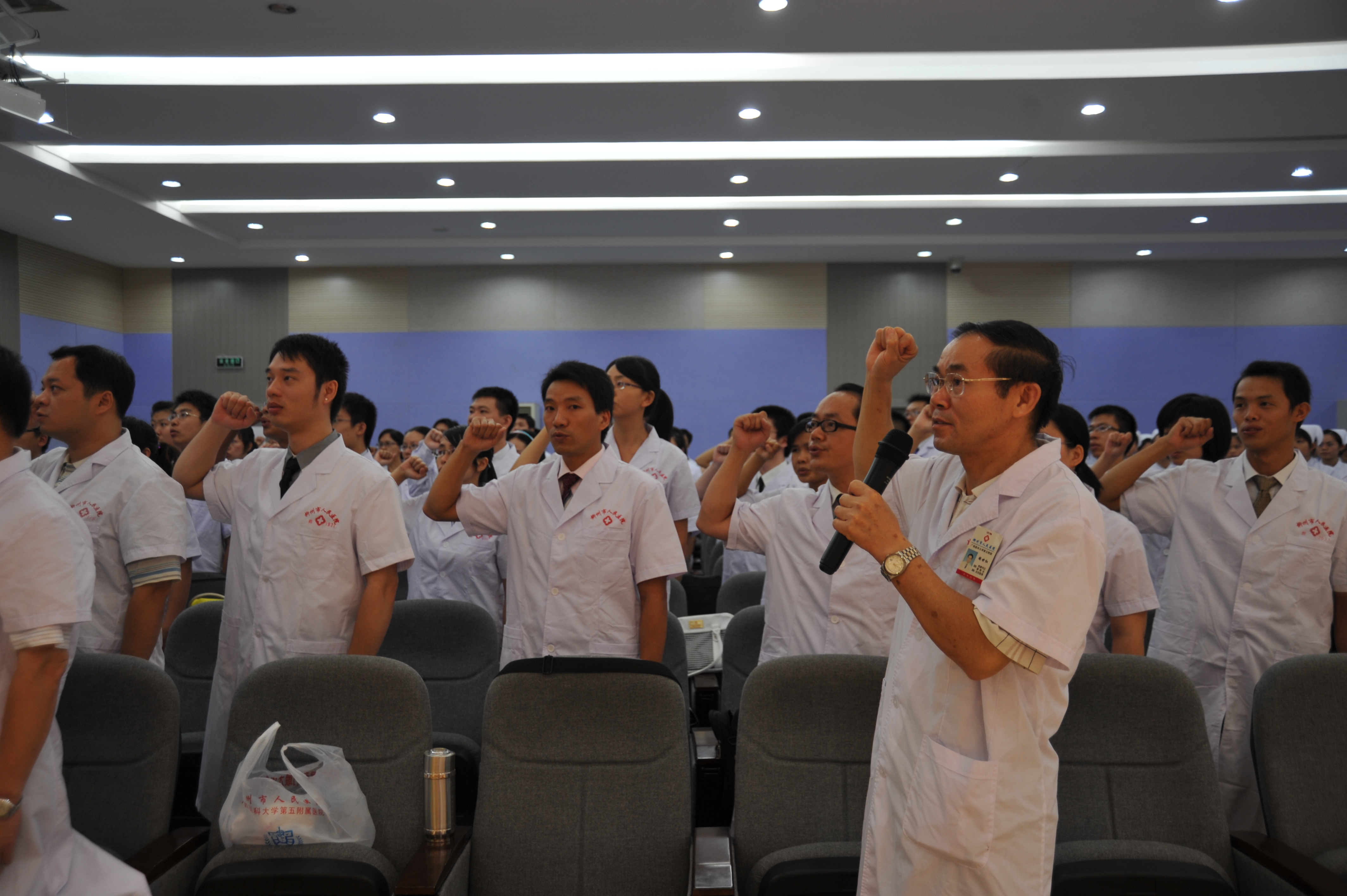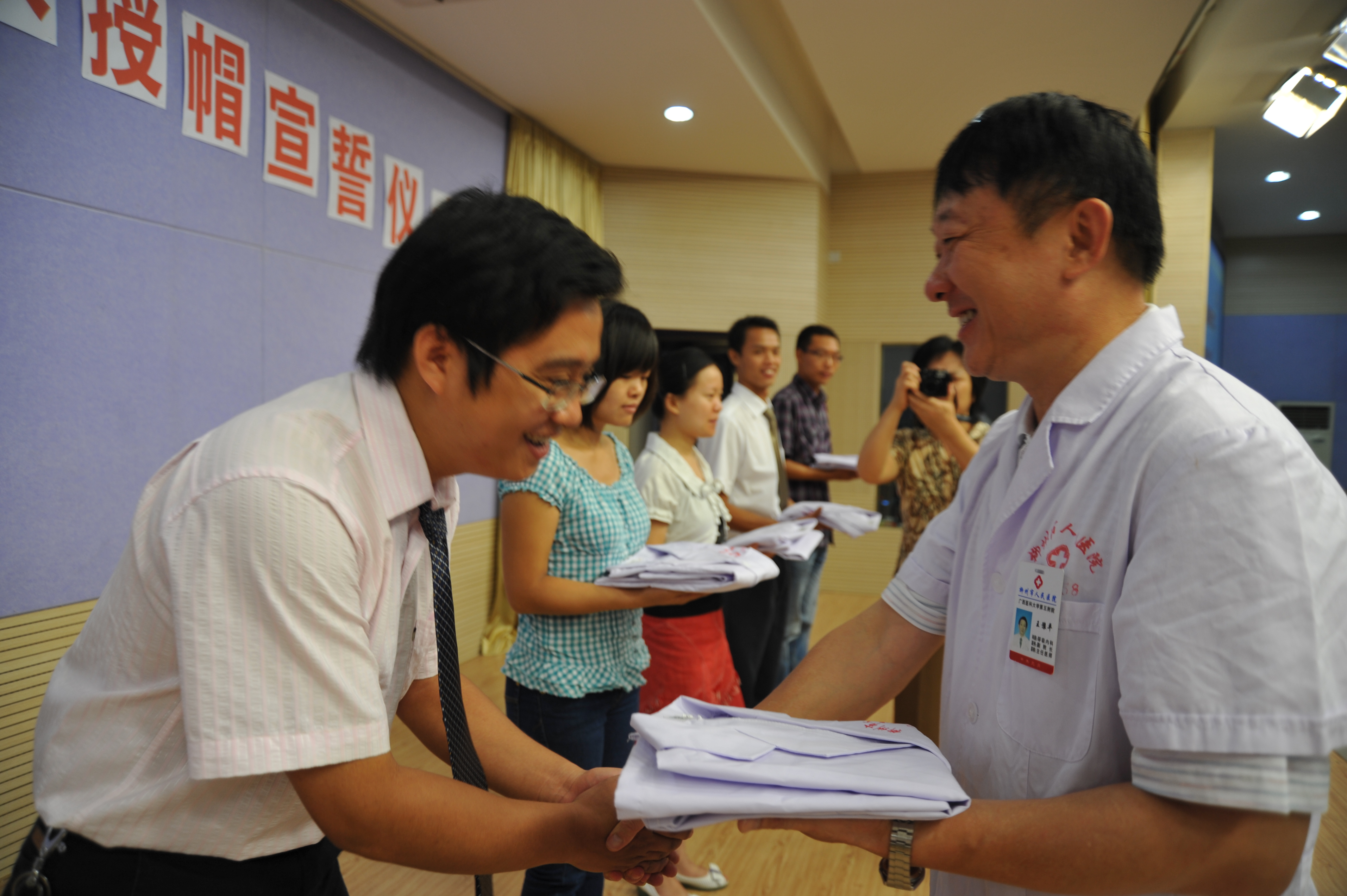 培訓結束后,舉行了新員工授衣授帽宣誓儀式。醫院黨委書記胡世紅教授、副院長王豫平教授為新入院的醫生們舉行了授衣勉勵儀式,護理部主任蔡潔等20名護士長們為新入院的護士們舉行了授帽祝福儀式,胡世紅書記和蔡潔主任還分別帶領醫生與護士們莊嚴宣誓。整個活動儀式由院團委主持。