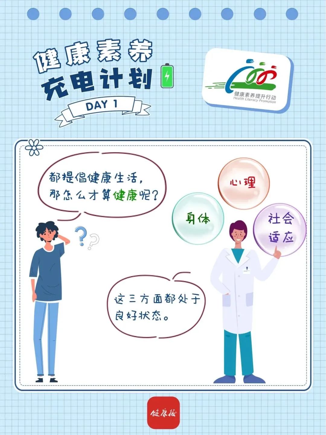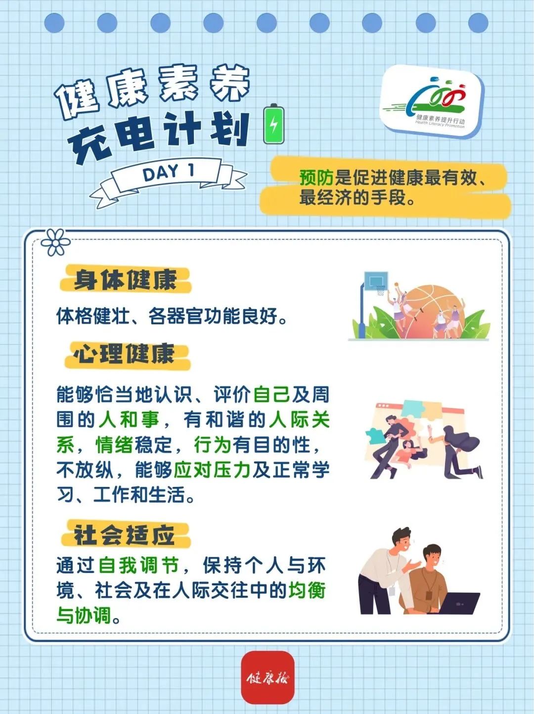 世界衛(wèi)生組織(WHO)提出的這個(gè)定義提示我們:健康不僅僅是指身體沒有疾病、不虛弱,而是指身體、心理和社會(huì)適應(yīng)三個(gè)方面都處于良好狀態(tài)。