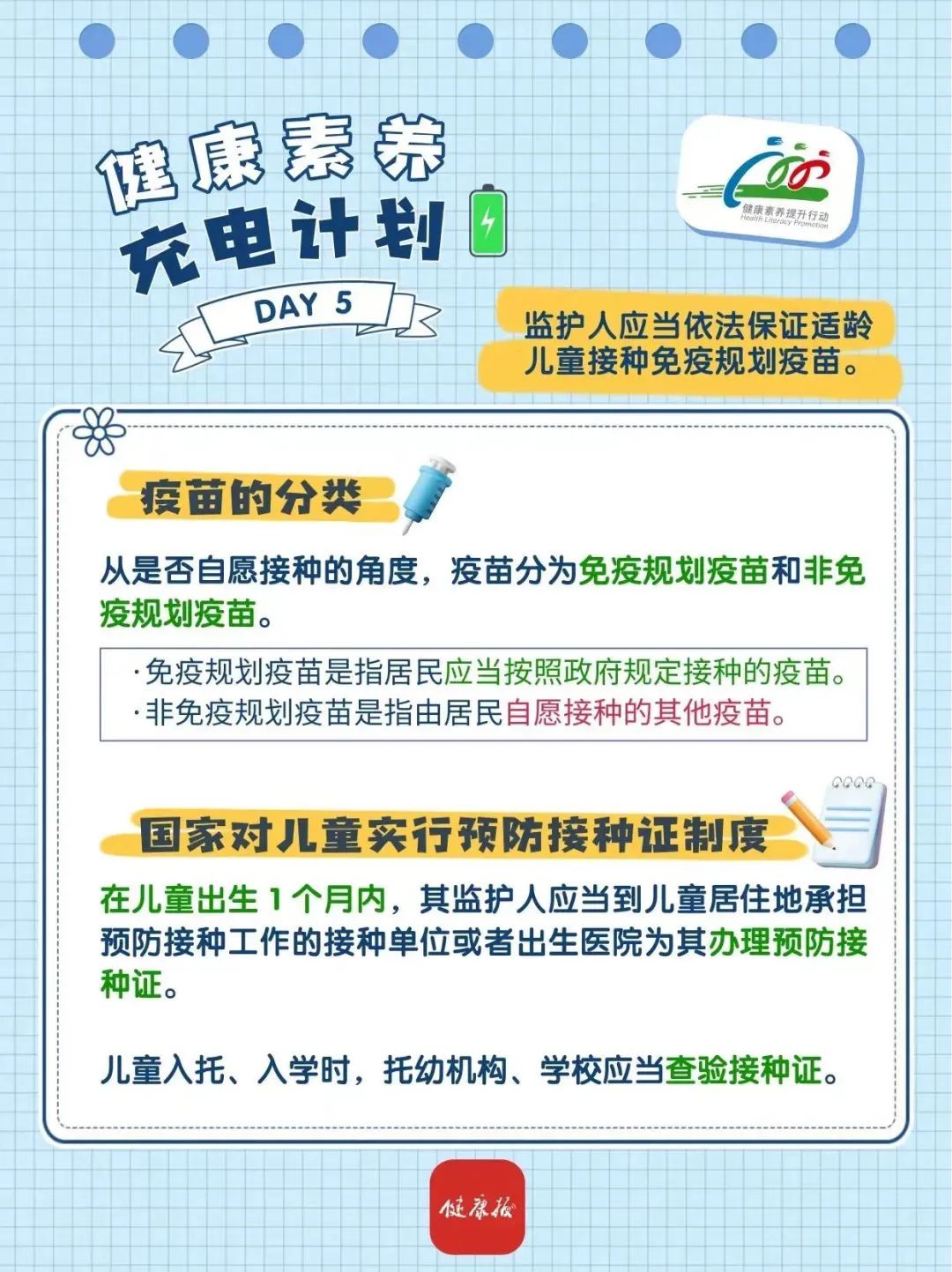 居住在中國境內的居民,依法享有接種免疫規劃疫苗的權利,履行接種免疫規劃疫苗的義務。監護人應當依法保證適齡兒童接種免疫規劃疫苗。國家對兒童實行預防接種證制度。在兒童出生1個月內,其監護人應當到兒童居住地承擔預防接種工作的接種單位或者出生醫院為其辦理預防接種證。兒童入托、入學時,托幼機構、學校應當查驗接種證。