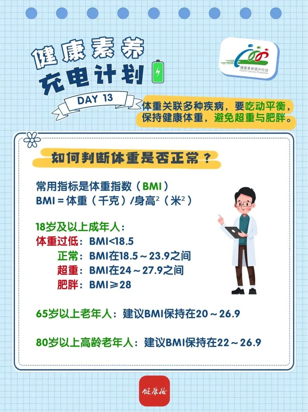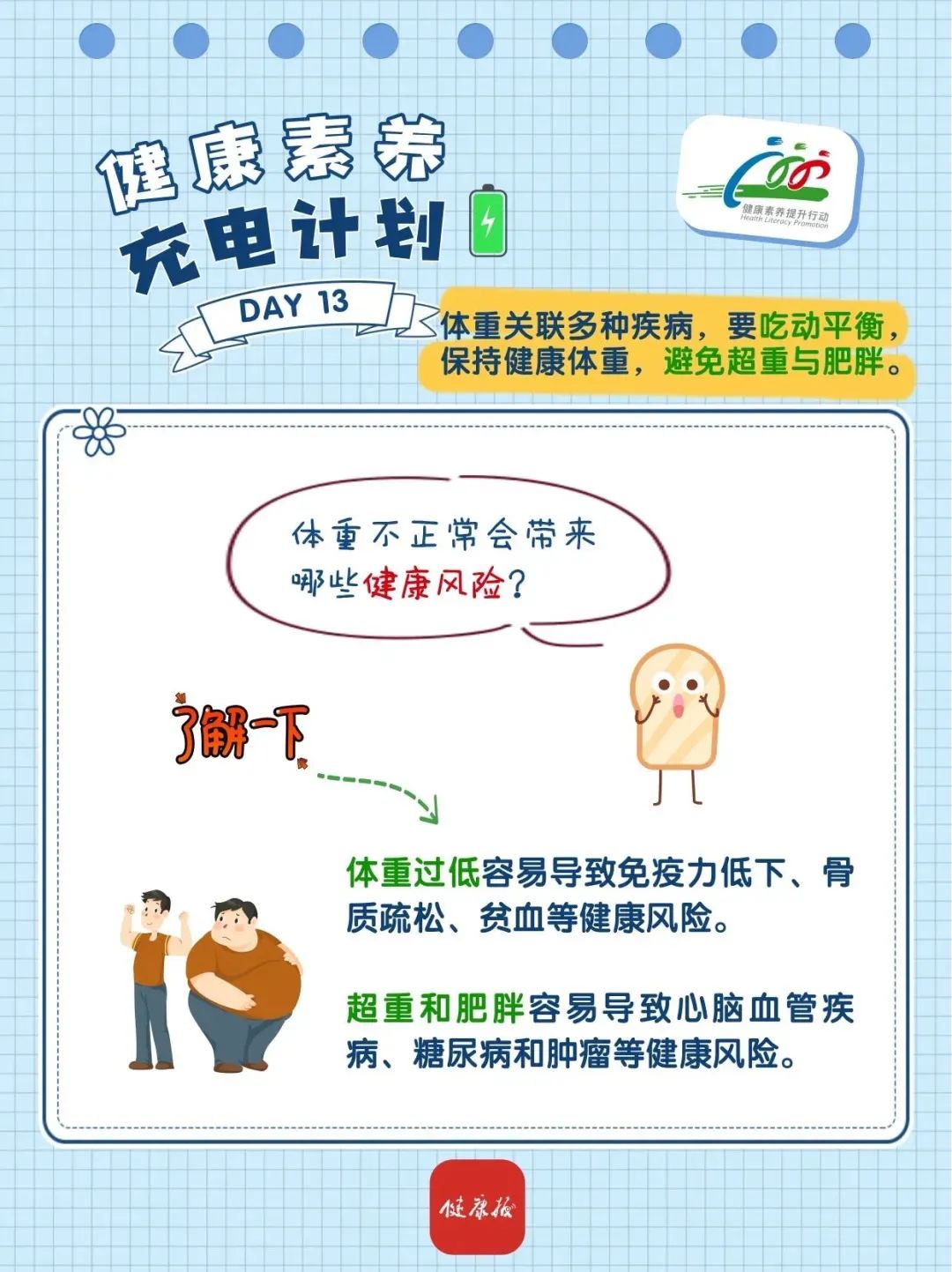 體重和健康密切相關,體重異常(過輕或過重)會影響健康,保持健康體重對于維護和促進健康至關重要。健康體重是指長期保持體重良好的健康狀態。體重過低容易導致免疫力低下、骨質疏松、貧血等健康風險;超重和肥胖容易導致心腦血管疾病、糖尿病和腫瘤等健康風險。體重是否正常主要取決于能量攝入與消耗的平衡,即吃動平衡。進食量大而身體活動量不足,多余的能量就會在體內以脂肪的形式儲存下來,造成超重或肥胖;相反,進食量不足或身體能量消耗大,可引起體重過低或消瘦。
