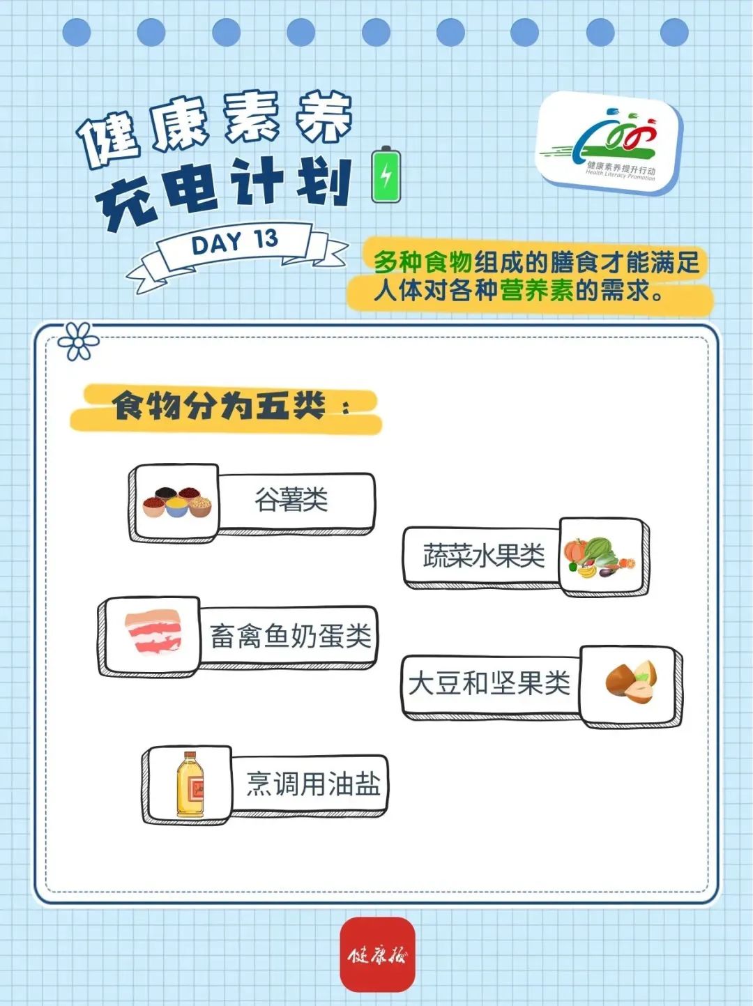 食物可以分為谷薯類,蔬菜水果類,畜禽魚奶蛋類,大豆和堅果類以及烹調用油鹽五類。多種食物組成的膳食才能滿足人體對各種營養素的需求。建議平均每天攝入12 種以上食物,每周攝入25 種以上。通過同類食物互換、小份備餐以及葷素搭配、粗細搭配、蔬菜深淺搭配,實現食物多樣化。偏食、挑食會導致某些營養素攝入不足,容易引起營養不良,甚至導致疾病。日常生活中要做到膳食平衡,食物多樣,三餐規律,飲食有度。早餐提供的能量應占全天總能量的25%~30%,午餐占30%~40%,晚餐占30%~35%。