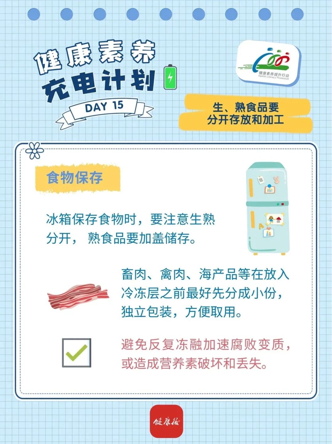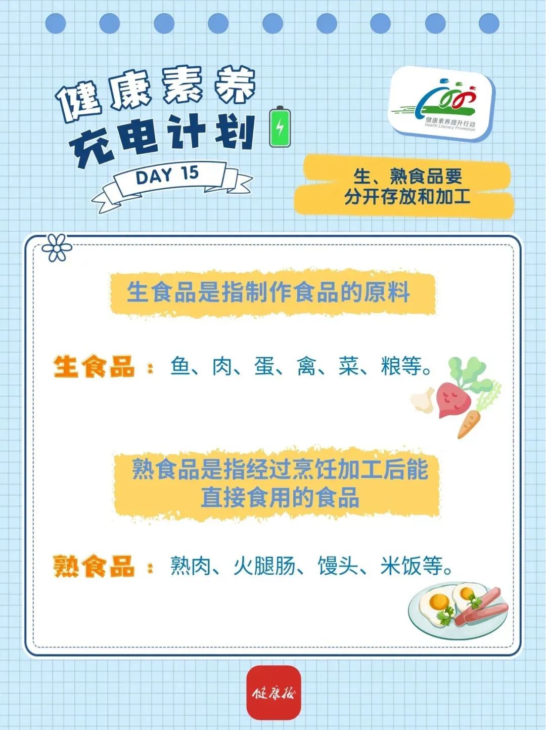 生、熟食品要分開存放和加工,生吃蔬菜水果要洗凈,不吃變質、超過保質期的食品。