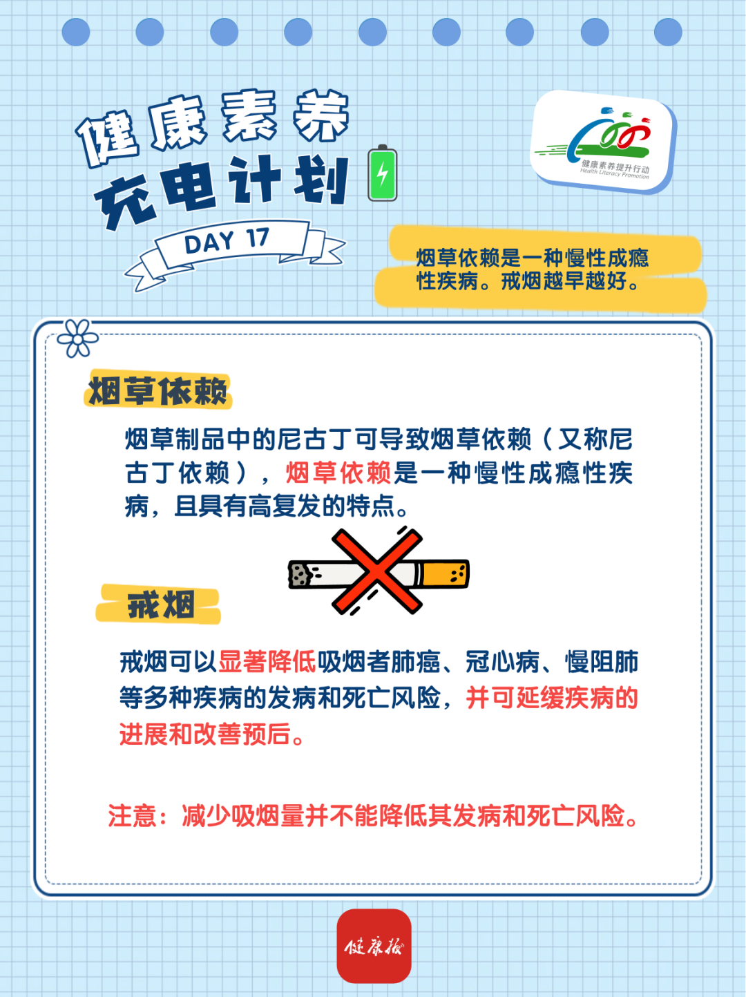 煙草依賴是一種慢性成癮性疾病。戒煙越早越好。任何年齡戒煙均可獲益,戒煙時可尋求專業戒煙服務。