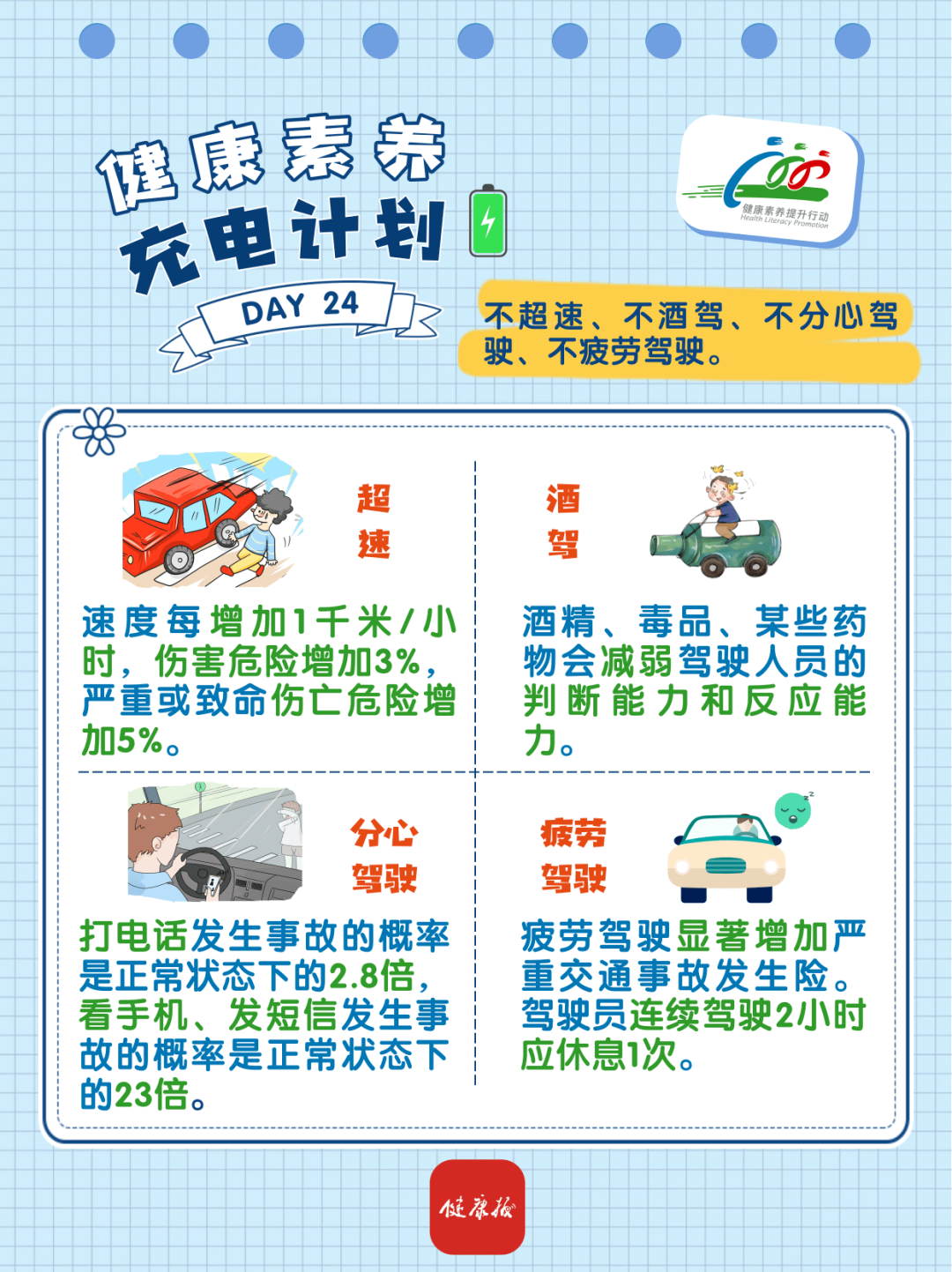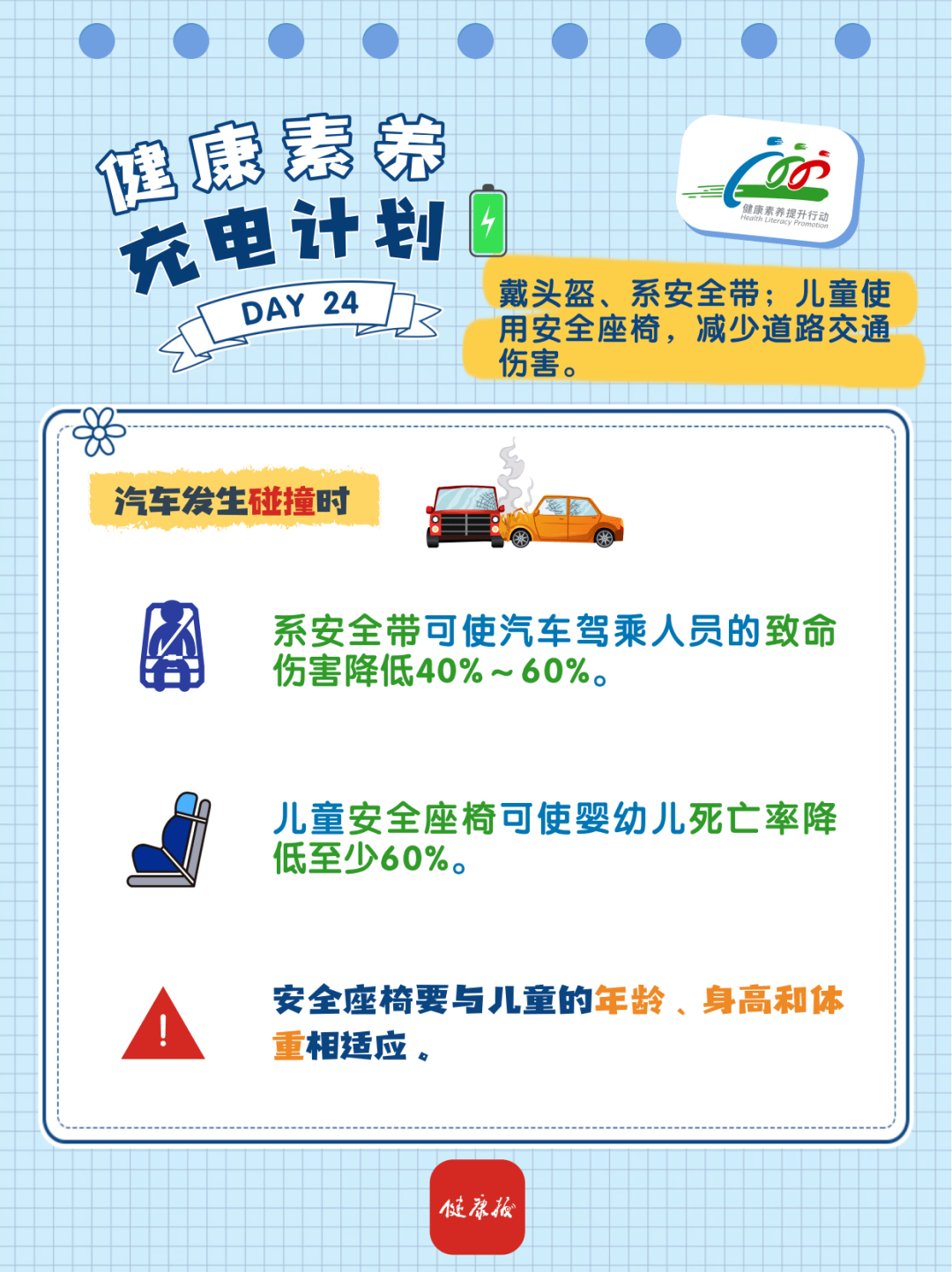 戴頭盔、系安全帶;不超速、不酒駕、不分心駕駛、不疲勞駕駛;兒童使用安全座椅,減少道路交通傷害。