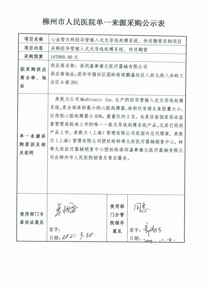 柳州市人民醫院心血管內科經導管植入式無導線起搏系統、傳送鞘管單一來源采購項目公示