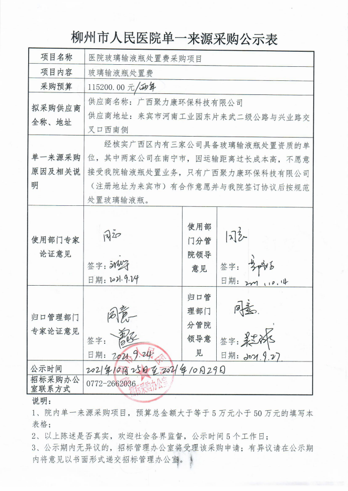 柳州市人民醫院玻璃輸液瓶處置單一來源采購項目公示