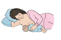2.在媽媽可以翻身后,使用側躺式(如下圖3)或半躺式(如上圖1)的方式喂奶,這兩種姿勢可以避免寶寶壓到手術傷口;