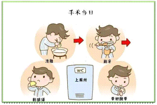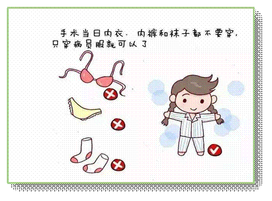 3.手術(shù)當日清晨您可以洗臉刷牙,但不能飲水,排空大小便。更換好病號服,不能穿內(nèi)衣、內(nèi)褲,取下假牙、飾品、發(fā)卡、手表、眼鏡,不帶手機及貴重物品進入手術(shù)室。