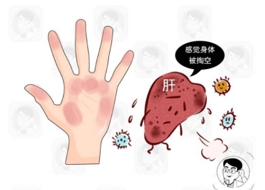 肝病面容是指由于肝臟疾病,最常見的是肝硬化,導致患者面部皮膚色澤逐漸變暗,臉色發(fā)黑、沒有光澤彈性差,皮膚干燥、粗糙,甚至出現(xiàn)“古銅色”面容;肝掌指患慢性肝炎特別是肝硬變后,在手掌大拇指和小指的根部的大小魚際處皮膚出現(xiàn)片狀充血,或是紅色斑點、斑塊,加壓后變成蒼白色。