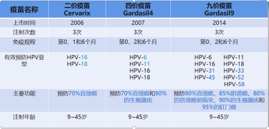 此外,我們說宮頸癌可以預(yù)防,是因為HPV疫苗的問世,使得接種HPV疫苗成為降低宮頸癌發(fā)生率最直接、最經(jīng)濟有效的的手段。目前國內(nèi)現(xiàn)有的疫苗為二價、四價疫苗和九價疫苗,它們的區(qū)別主要是預(yù)防的HPV型別不同,應(yīng)用的年齡段不同,以下是我國已上市的三種HPV疫苗的區(qū)別對比圖。
