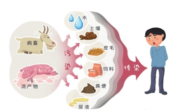 皮膚及黏膜接觸:直接接觸病畜或其排泄物、陰道分泌物、娩出物;在飼養、擠奶、剪毛屠宰以及加工皮、毛、肉等過程中沒有注意防護,可經受損的皮膚或眼結膜感染;也可間接接觸病畜污染的環境及物品而感染。