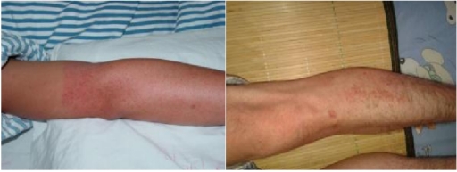 于病程5-7日出現(xiàn)多樣性皮疹、皮下出血點(diǎn)等,以麻疹樣和出血性皮疹為主,不高出皮膚,皮疹分布于四肢驅(qū)干或頭面部,多有癢感。