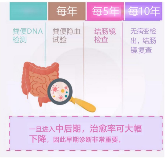 定期進行結直腸癌篩查可以早期發現結直腸癌或癌前病變,建議40歲以上人群定期進行結直腸癌風險篩查,高危人群可提前至18-20歲。