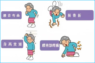 骨質疏松主要表現為:疼痛、身高變矮、駝背、易骨折及呼吸系統功能下降。