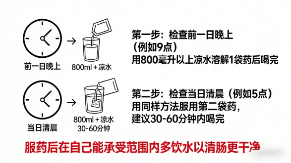 2.檢查當日清晨(例如5點):同樣方法再服用第二袋藥,建議在30-60分鐘內喝完。服藥后在自己能承受的范圍內多飲水,才能清腸更干凈。