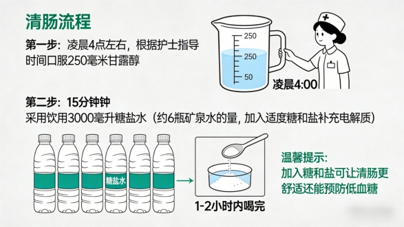 1.檢查當日清晨(根據護士指導的時間,例如凌晨4點):先口服250毫升甘露醇。