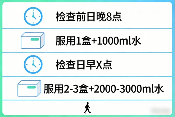 1.檢查前一日晚上8點:服用1盒藥,用1000毫升溫開水沖服。
