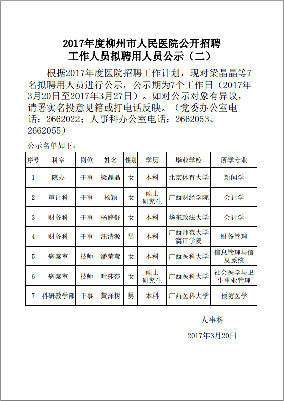 2017年度柳州市人民醫院公開招聘 工作人員擬聘用人員公示(二)