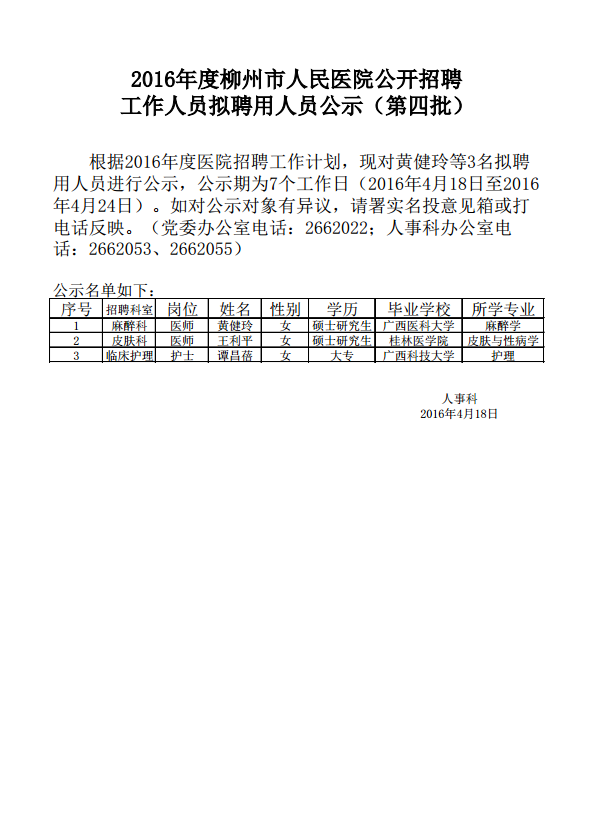 2016年度柳州市人民醫院公開招聘工作人員擬聘用人員公示(第四批)