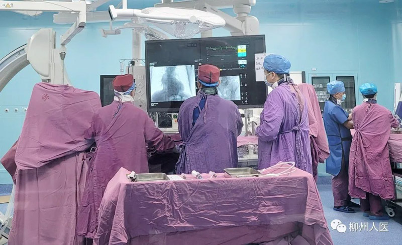 去年夏季的一個晚上,生死時速再次上演。一名七十多歲的女性患者在外院就診時,突然在診室里跌倒,檢查顯示為急性心肌梗死,當地醫院立即實施救治,同時向柳州市人民醫院求助救援。