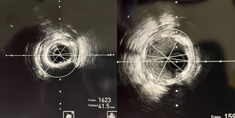 術中,心血管內科介入團隊將Shockwave C2 IVL 3.0*12mm 震波球囊置入前降支病變處,以4-6atm進行擴張后觸發8次10秒沖擊波,實施鈣化斑塊碎裂術,術后支架膨脹不全處明顯擴張,并順利于前降支近中段植入1枚支架。復查IVUS可見鈣化斑塊碎裂,支架貼壁和膨脹良好,血管擴張成形滿意,術后患者胸痛癥狀明顯好轉。