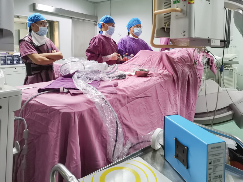 由于患者前降支存在嚴重冠脈狹窄伴鈣化病變,是常規介入手段難以解決的,冠狀動脈鈣化常導致病變部位不能充分擴張,球囊和支架難以通過,支架不能完全膨脹,手術的并發癥發生率會明顯升高。心血管內科立即組織專家開展討論,對患者病情進行了全面評估,最終決定運用ShockwaveIVL血管內沖擊波球囊技術為患者進行治療。