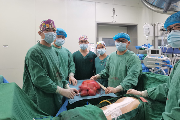 據胃腸外科副主任賀孝文介紹,患者被確診為腹腔軟組織腫瘤(脂肪肉瘤可能性大),巨大腫瘤像個大球一樣填滿了患者的整個腹腔,擠占了其它正常臟器的空間,與小腸、胰腺、腹主動脈、下腔靜脈、腸系膜血管解剖關系密切,切除該腫瘤,解決它與周圍重要器官的緊密粘連便是一項“大考驗”,既要把腫瘤切干凈,又要讓其他器官不受損,并且減少術中出血量,其中的難度可想而知。且切除腫瘤解除壓迫后,血液循環再分布,再灌注損傷易導致相關臟器功能衰竭,隨時可能發生生命危險。